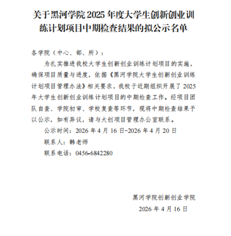 关于黑河学院2025年度大学生创新创业训练计划项目中期检查结果的拟公示名单