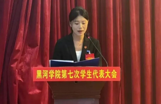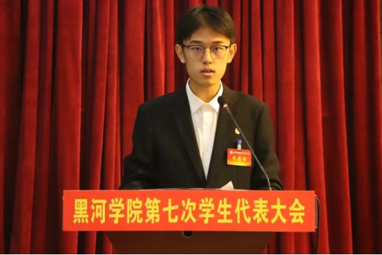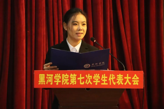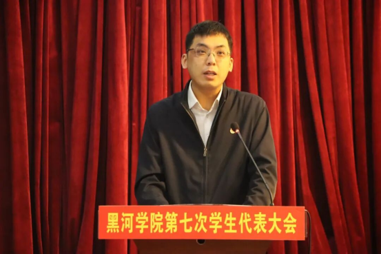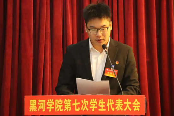 黑河学院第二十八届学生会执行主席臧佳永作题为《明德笃学砺初心,接续奋斗谱新篇,团结带领广大同学为特色鲜明应用型大学建设贡献青春力量》的工作报告。